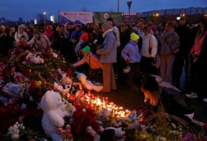 People gather at a makeshift memorial to the victims of a shooting attack set up outside the Crocus City Hall concert venue in the Moscow Region, Russia, March 23, 2024. REUTERS/Maxim Shemetov