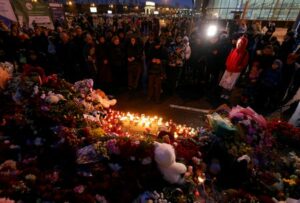 People stand by a memorial to the victims of a shooting attack outside the Crocus City Hall concert venue near Moscow, March 23, 2024. REUTERS/Maxim Shemetov