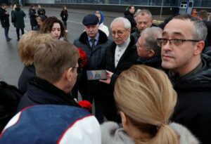 People, including Moscow City Duma deputy Nikolai Zubrilin, watch the broadcast of Russian President Vladimir Putin’s address to the nation following a shooting attack at the Crocus City Hall concert venue, at the site of the attack in the Moscow Region, Russia, March 23, 2024. REUTERS/Yulia Morozova