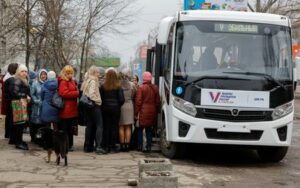 Voters gather outside a mobile polling station located in a bus, on the final day of Russia’s presidential election in the course of Russia-Ukraine conflict in Makiivka (Makeyevka) in the Donetsk region, Russian-controlled Ukraine, March 17, 2024. REUTERS/Alexander Ermochenko