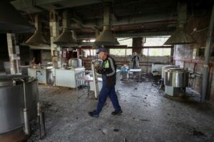 Workers clean a kitchen area in a hospital building damaged by a Russian missile strike, amid Russia’s attack on Ukraine, in Kharkiv, Ukraine April 27, 2024. REUTERS/Vyacheslav Madiyevskyy