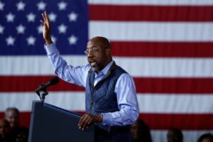 U.S. Senator Raphael Warnock (D-GA) speaks during U.S. President Joe Biden’s campaign event at Pullman Yards in Atlanta, Georgia, U.S. March 9, 2024. REUTERS/Evelyn Hockstein