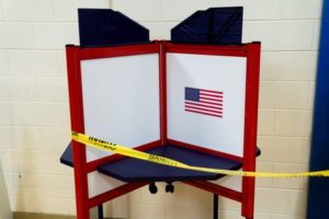 FILE PHOTO: An unused voting booth is marked with tape at a polling place during the New Hampshire presidential primary election in Nashua, New Hampshire, U.S., January 23, 2024. REUTERS/Elizabeth Frantz
